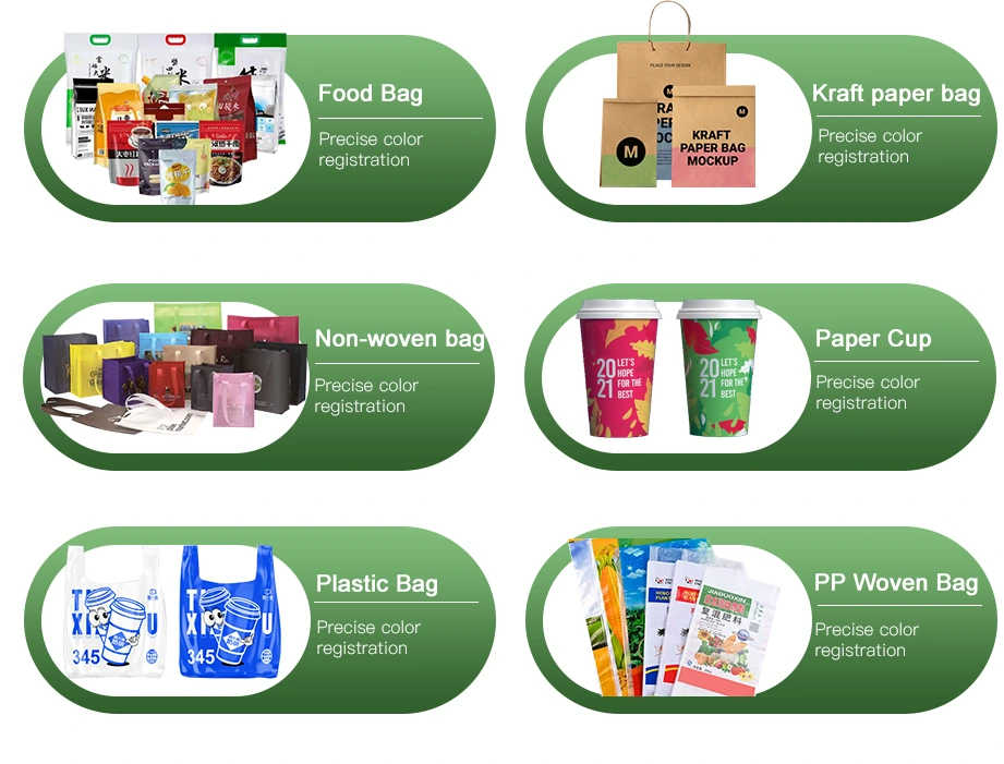 Vhodné pre PE, BOPP, PET, CPP, papier a iné flexibilné substráty, ideálne pre balenie potravín, nákupné tašky, etikety a rôzne flexibilné obaly.